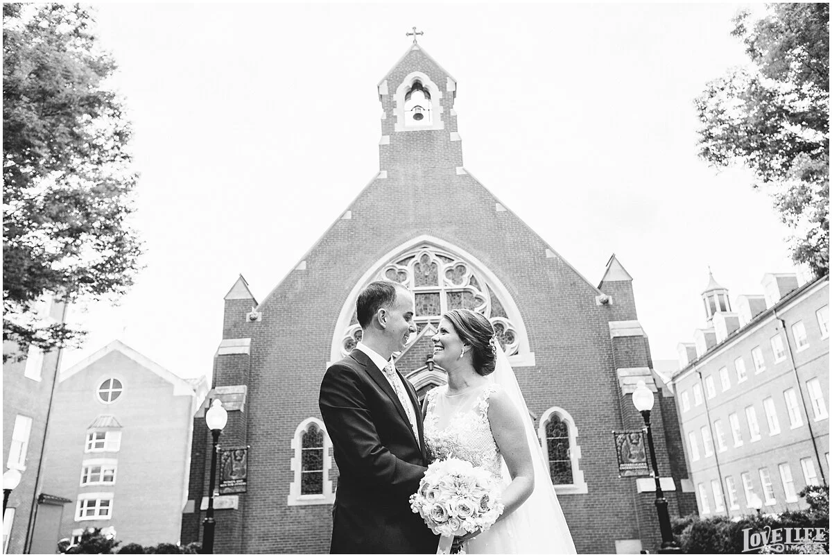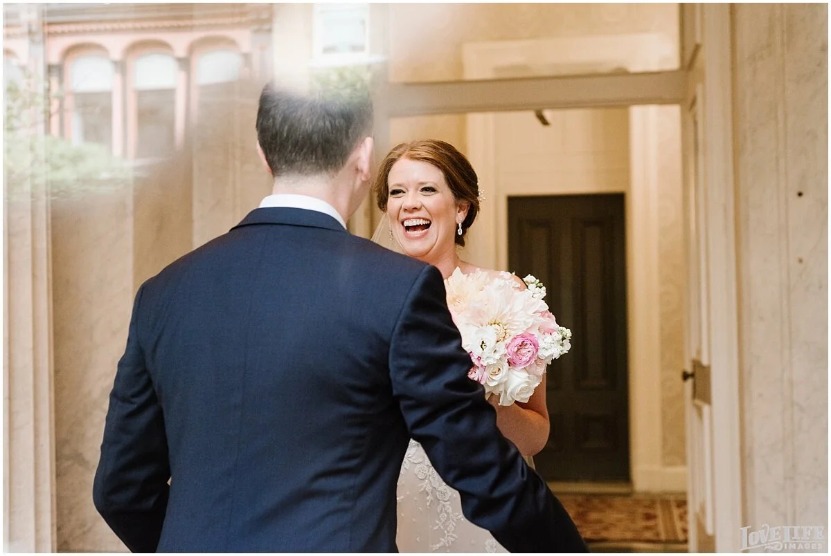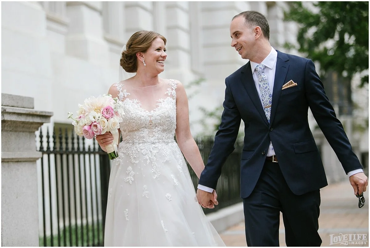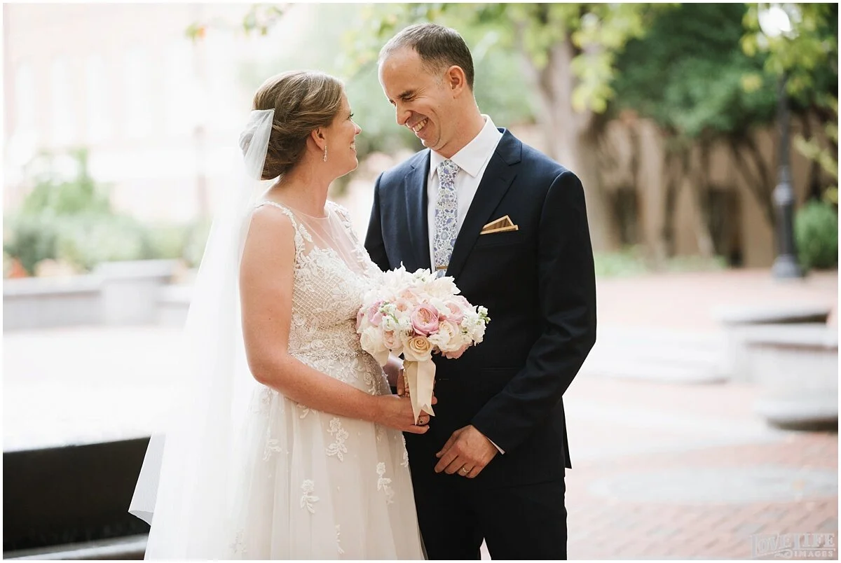 Ellen + Jeff had a beautiful wedding at Hotel Monaco in Washington, DC. They decided to do a first look to take the pressure off and add another memorable moment to their day. After the first look, we strolled around the grounds of the Hotel Monaco and the National Portrait Gallery to do more pictures before heading to Dahlgren Chapel at Georgetown University to say their “I dos”. The families & friends then celebrated with eating, dancing and laughing into the evening.
