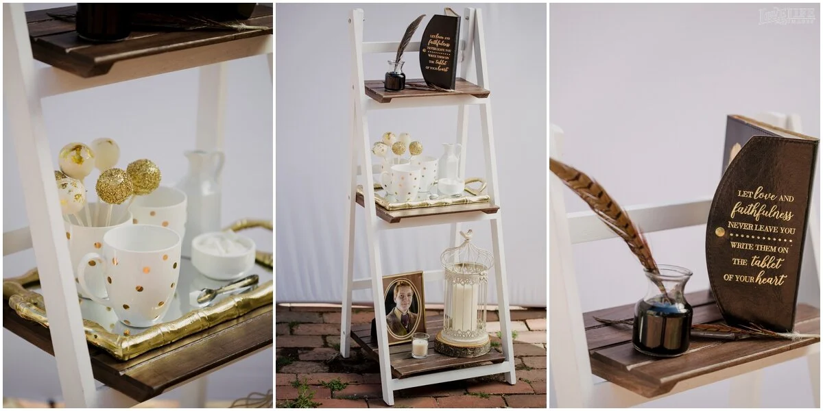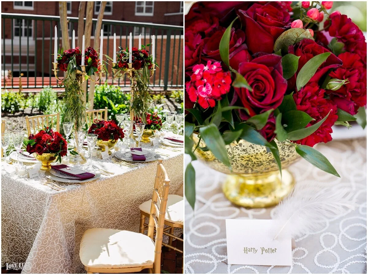 From Jazmine: "This shoot was inspired by George Weasley, older brother of Harry's best friend Ron, who wed his fellow Quidditch teammate, Angelina Johnson. The vision was to create an actual wedding that would take place in the magical world of Harry Potter! Small keys were placed around the Gryffindor-themed wedding cake, a vintage styled linen set the perfect platform for the stylish gold candelabras, and feathered place cards featuring our favorite characters established a bold look for the vintage outdoor wedding. Finishing touches pulled the theme off with quill and ink, Golden Snitch-inspired cake pops, and a beautiful memorial dedicated to the grooms twin brother, the late Fred Weasley, who would remain in their hearts, Always."