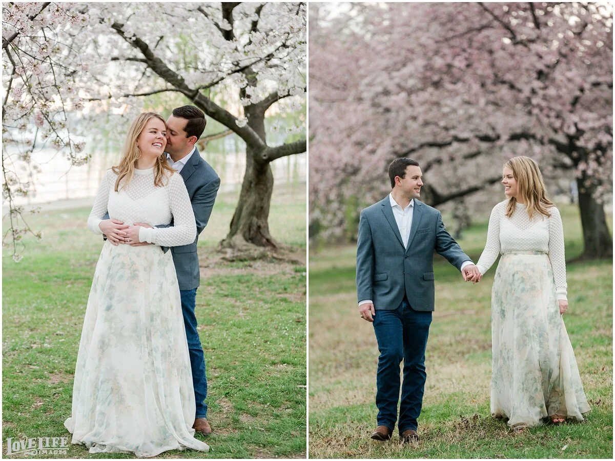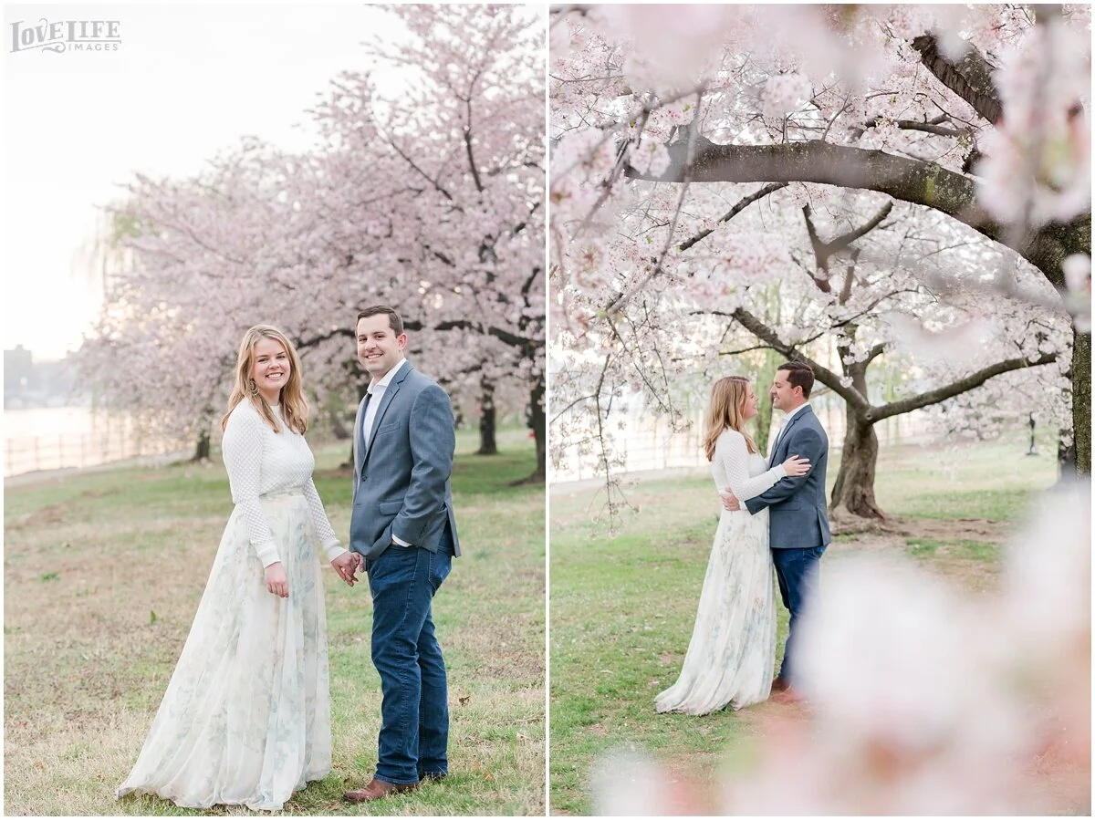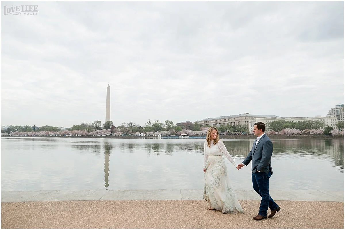 Cherry Blossom engagement sessions in Washington, DC are one of our most popular requests- and we love it! An early morning session gives you the chance to avoid some of the crowds, and Maty and Scott were up for the challenge! Starting at the Tidal Basin and moving over to the Jefferson Memorial gave us some variety in location. We love Maty’s flowy floral skirt- a perfect match for this spring morning. We can’t wait for their wedding this December at District Winery!