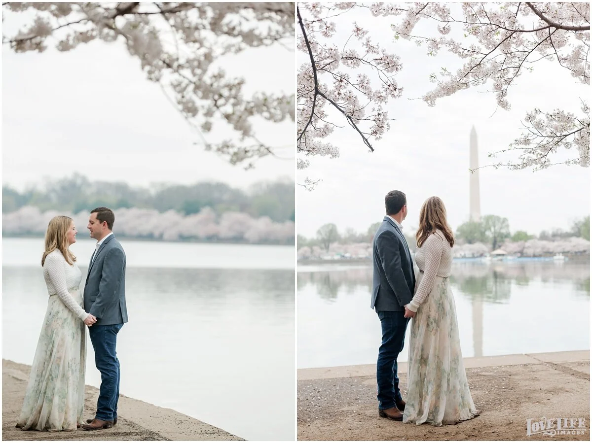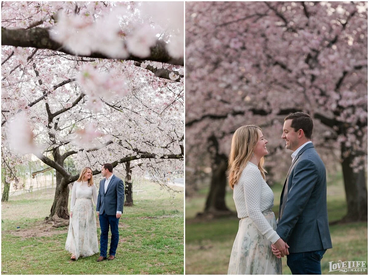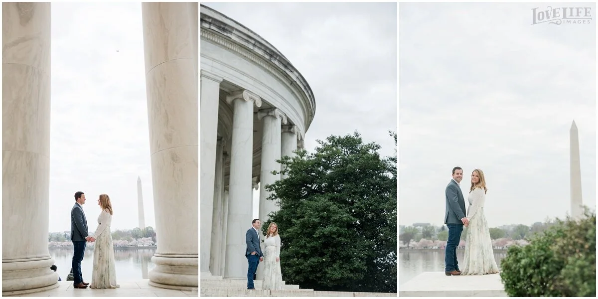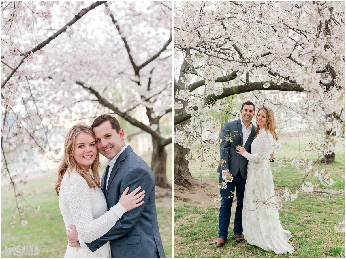 Cherry Blossom engagement sessions in Washington, DC are one of our most popular requests- and we love it! An early morning session gives you the chance to avoid some of the crowds, and Maty and Scott were up for the challenge! Starting at the Tidal Basin and moving over to the Jefferson Memorial gave us some variety in location. We love Maty’s flowy floral skirt- a perfect match for this spring morning. We can’t wait for their wedding this December at District Winery!