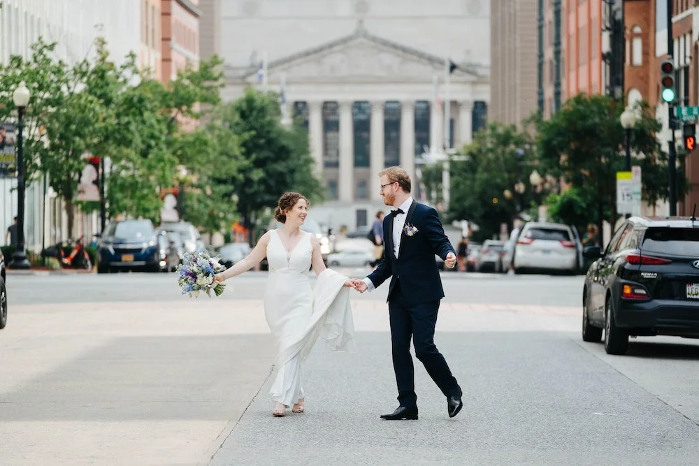 The Hotel Monaco in Washington, DC has long been one of my favorite wedding venues to work at. The timeless elegance is perfect for a wedding at any time of year. David and Elizabeth planned a beautiful summer wedding with classic details in a dusty blue and gold color palette. I loved Elizabeth’s simple wedding dress with the beautiful lace detailing. The bridesmaids were light and airy in their mix and match style, dusty blue bridesmaids dresses. The ballroom space at the Hotel Monaco is perfect for a wedding ceremony to give the feeling of a ceremony in the round. Photographing Jewish weddings is always a delight because of all the emotions and traditions they bring, from the ketubah signing to the meaningful ceremony actions to the hora. There is never a dull moment! I especially love the trend of “end of the night” photos with the bride and groom, as seen here when we took some playful portraits in the suite’s bathtub. Even if you are not doing a special send off like a sparkler exit, talk to your photographer about doing some special portraits of just the two of you to end the night.