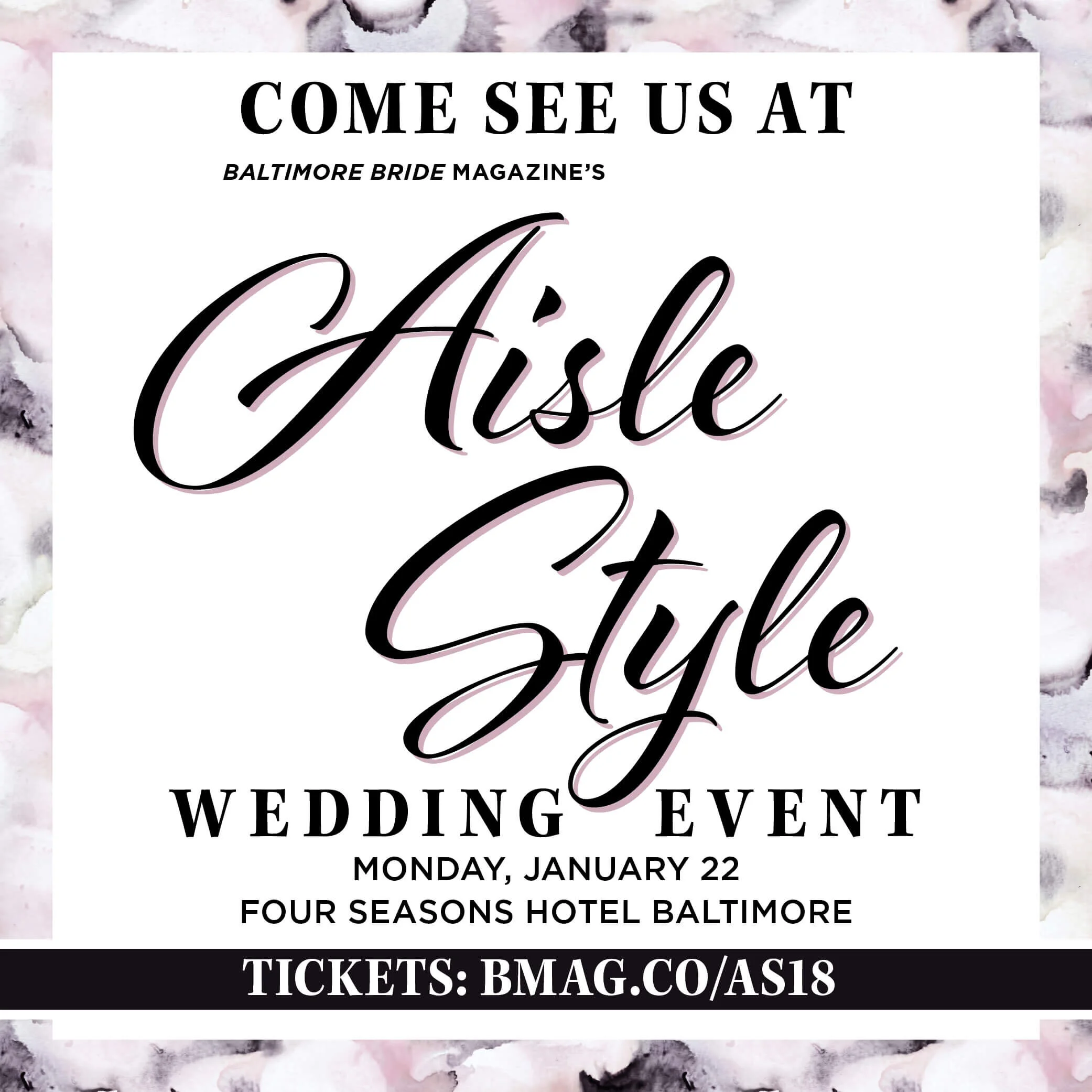 We are so excited to be a part of Baltimore Bride Magazine's 2018 Aisle Style Event at the gorgeous Four Seasons Baltimore. Join us for an evening of wedding planning while you sip a glass of bubbly and sample some tasty treats- there's even a bridal fashion show! Be sure to stop by our table if you are still searching for a wedding photographer- we'll be giving away a free engagement session to one lucky couple!