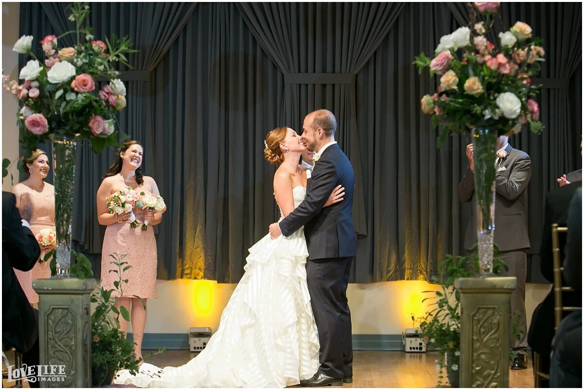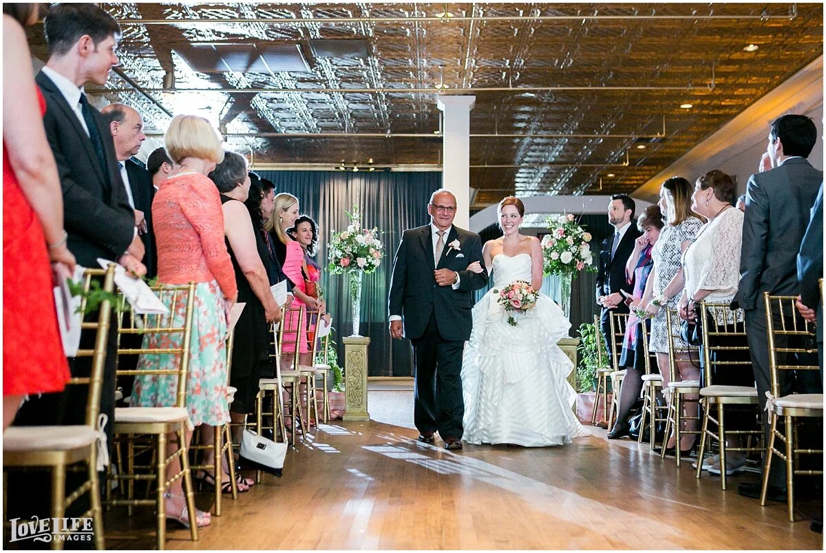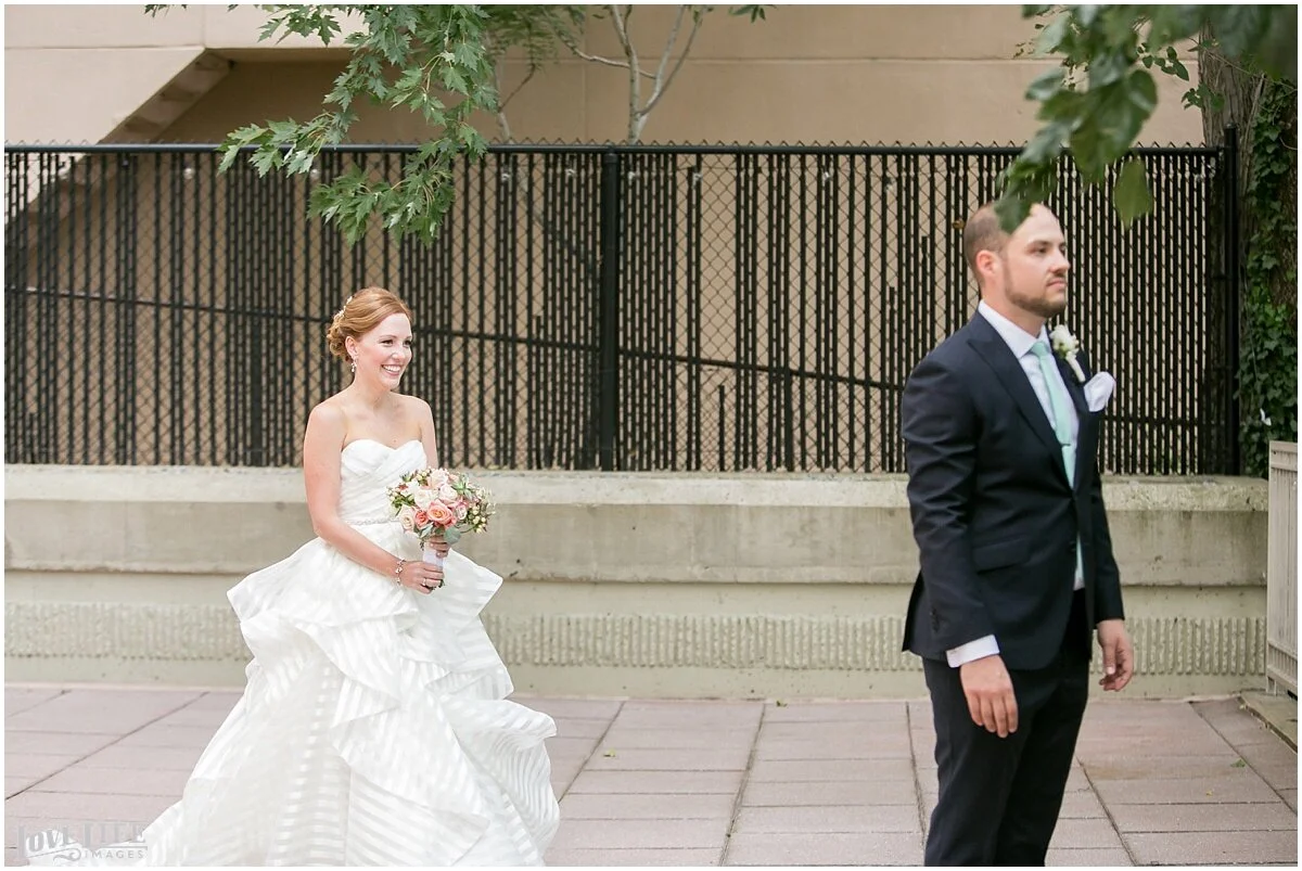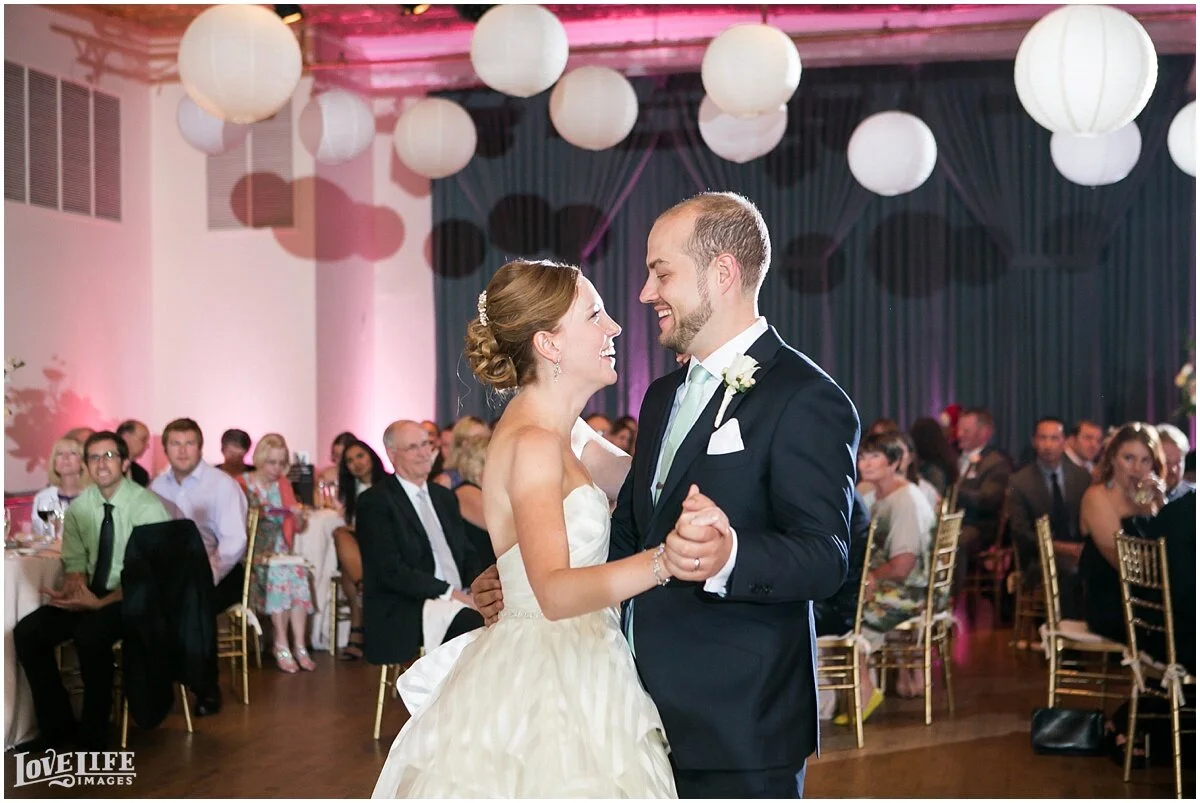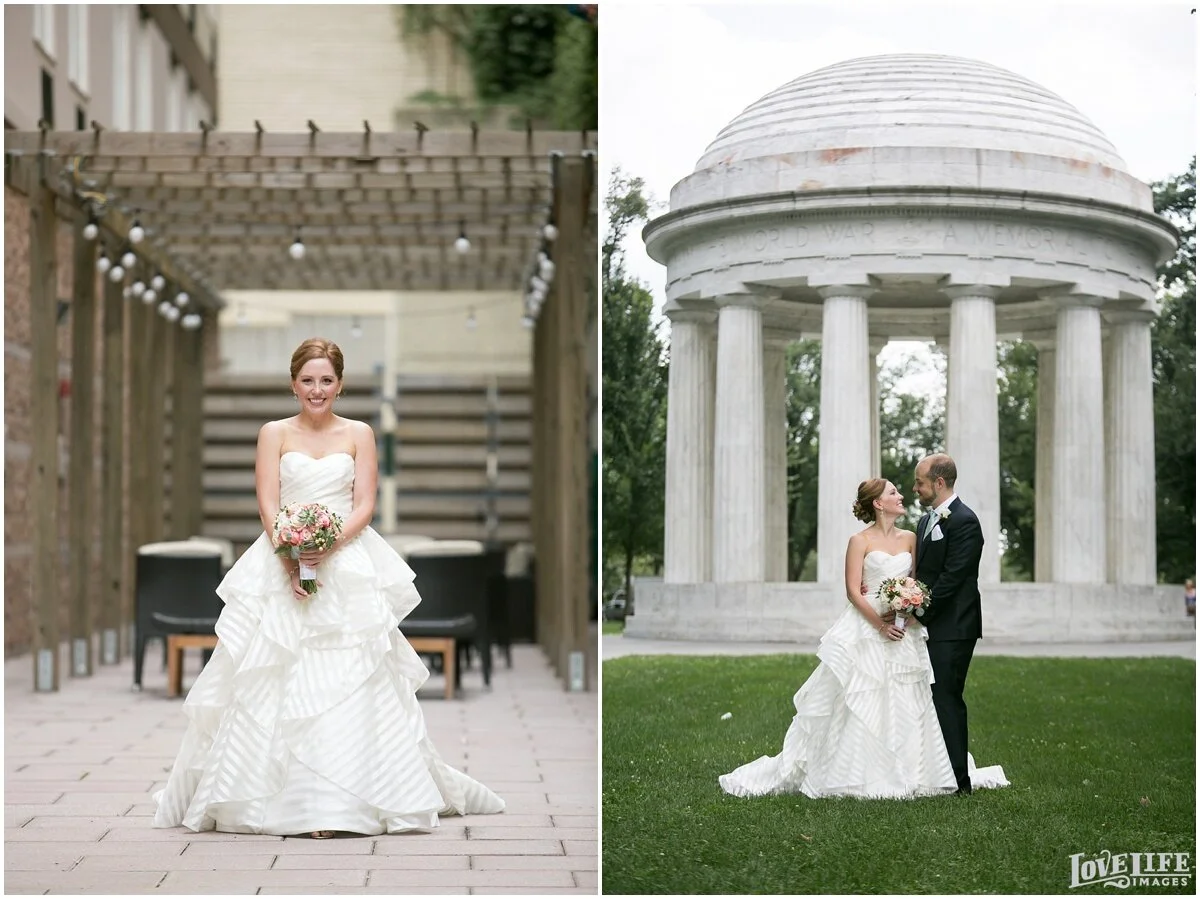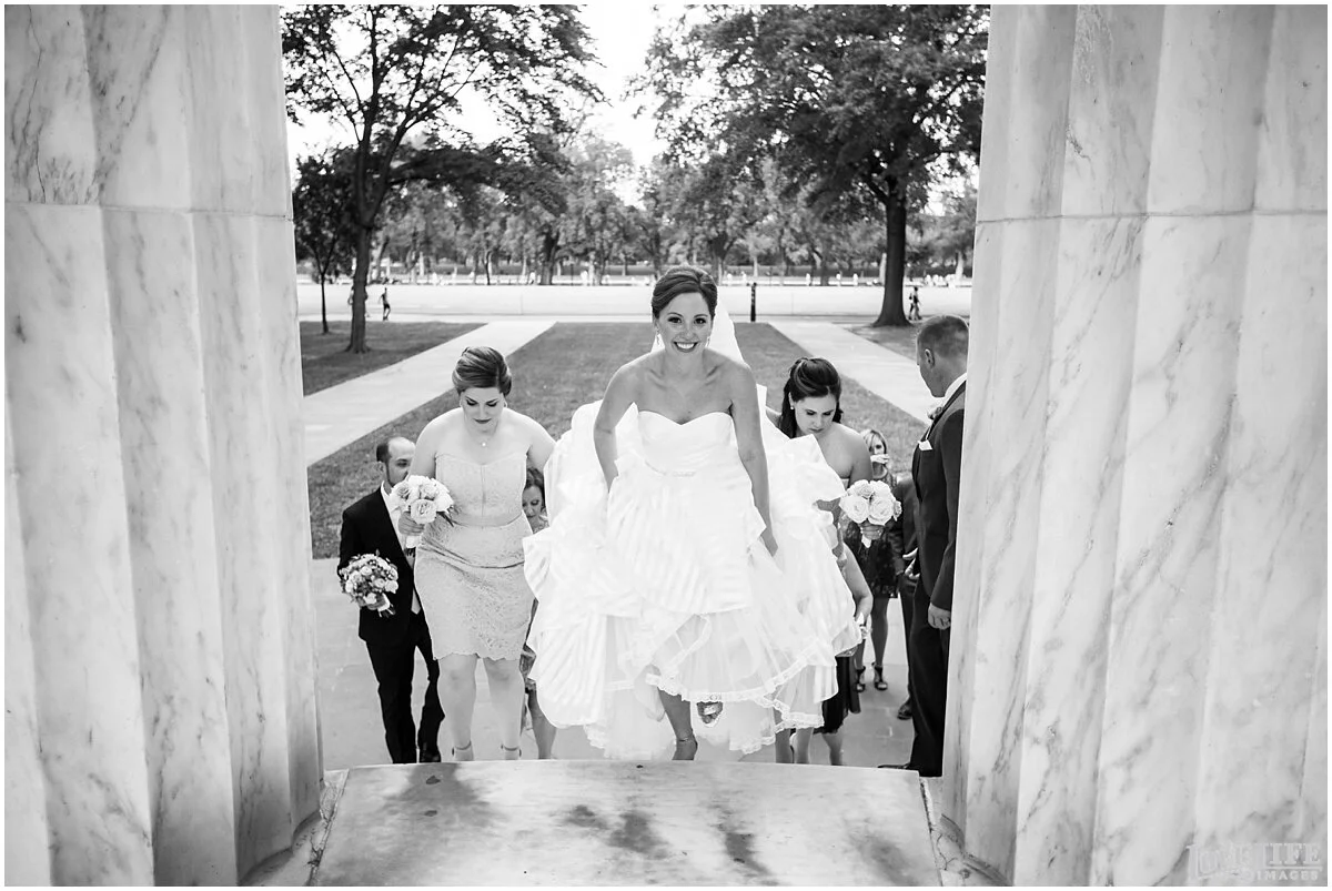The day started with getting ready at the Hilton Garden Inn and a first look on the hotel terrace. Katie looked absolutely stunning in her beautiful wedding gown and had a most radiant smile on her face the entire day! After the first look, we headed to DC War Memorial for photos with the wedding party. Clarendon Ballroom hosted these two for the ceremony and reception, complete with big white Chinese lanterns in the ceiling and a kick-ass band to stir up the dance floor. Their day went off without a hitch thanks to Kristi of GLOW Weddings & Events.