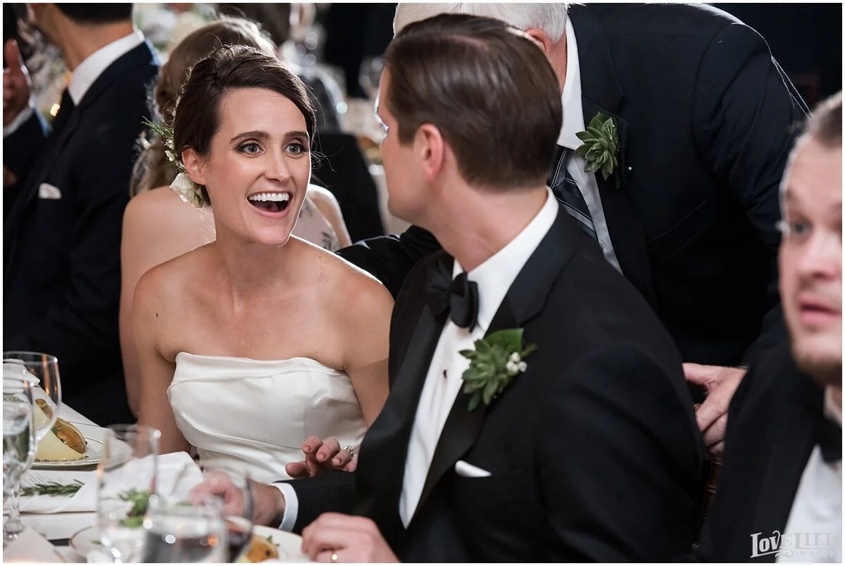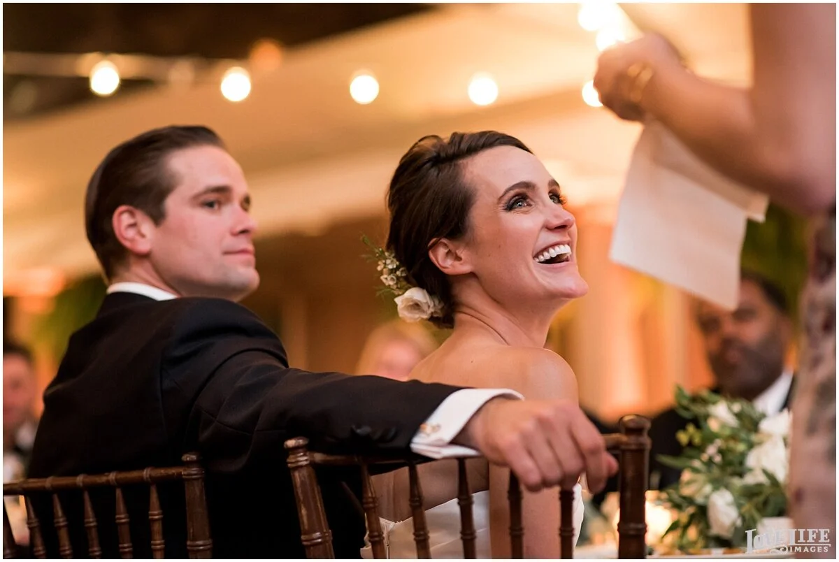 Christopher presented a less emotive outer appearance, but as usual, we cracked that as well. In all truth, it's easy when one has a couple who's so good together. It pleased me to see that I actually caught the fist-bump Christopher made walking out of the church with Britt. Again, it's a study in contrasts that highlights a person's inner joy. Seated beforehand, Christopher signs the certificate with all businesslike manner, and the fist-bump shows the inside we love to see. While I'm on the subject, I'm grateful for good, teasing toasts that give me photos like the one of Christopher being roasted.