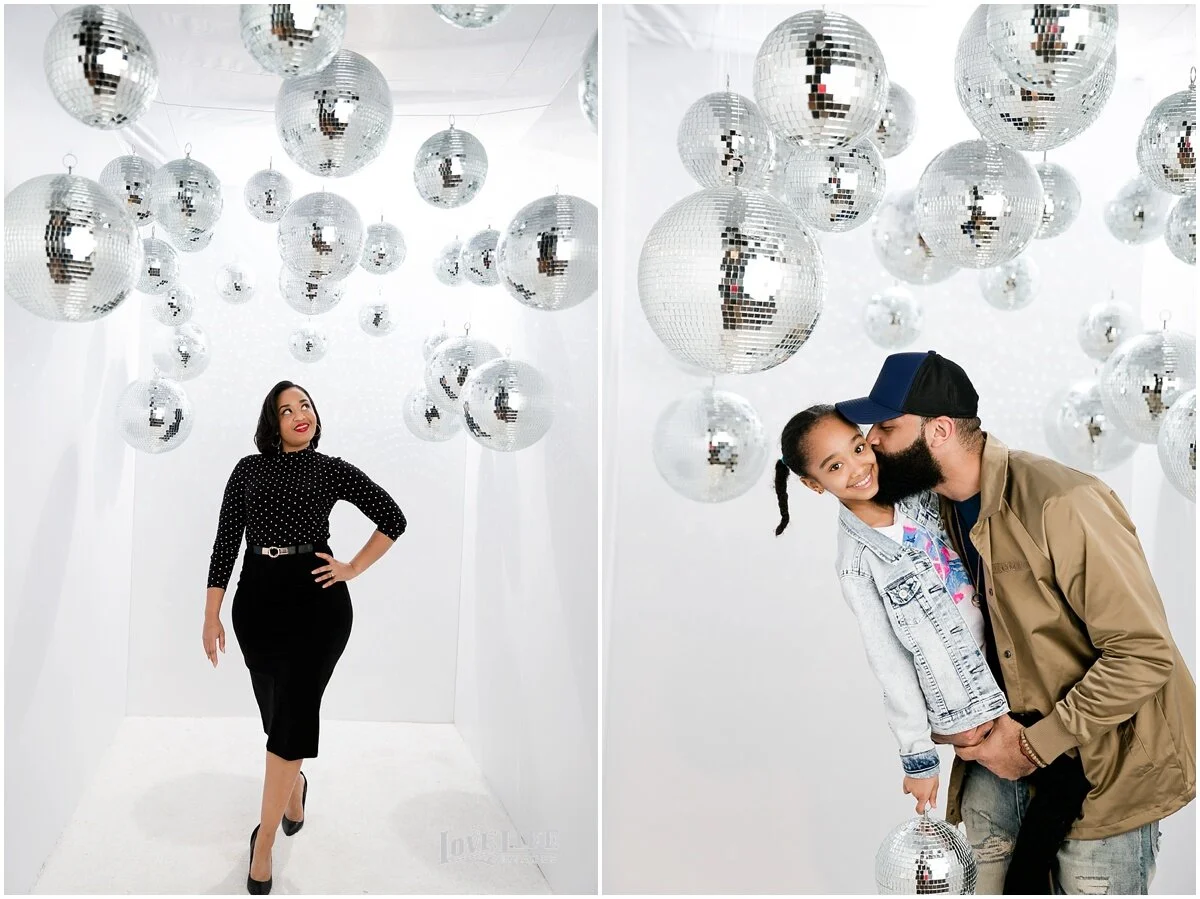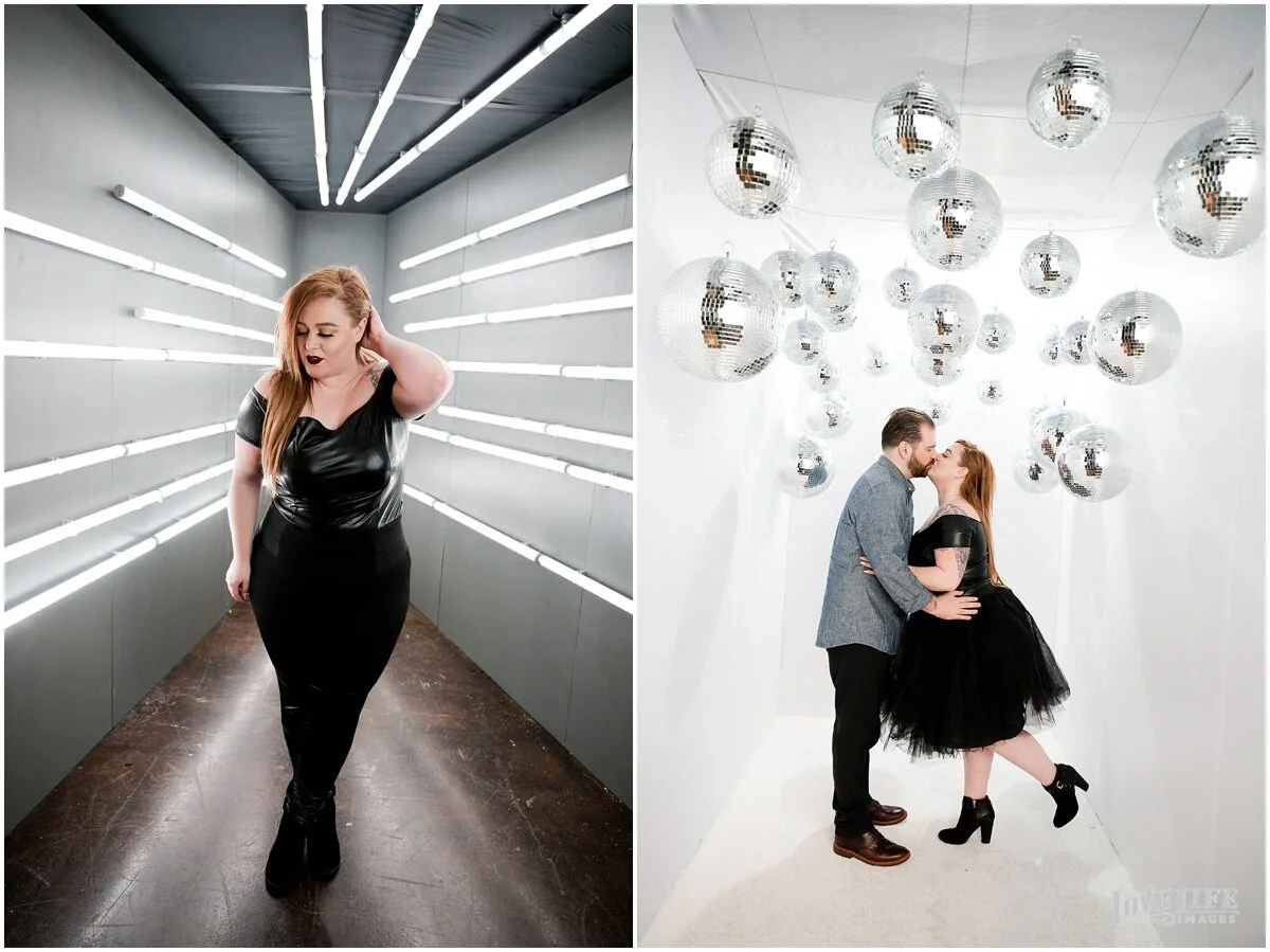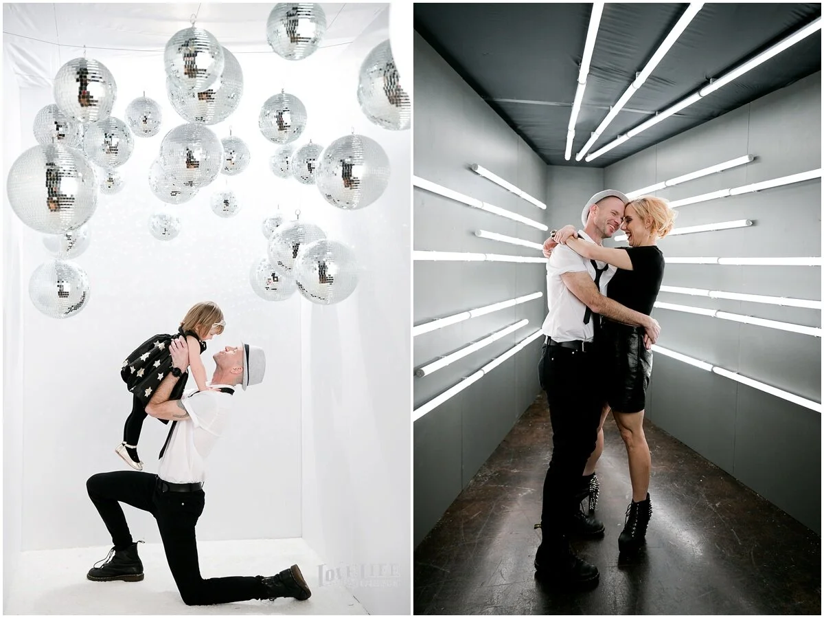 In winter, when the weddings are on hold and we have time to explore some creative endeavors, we come up with new ways to make photographs of our clients. In this recent collaboration with Revolution Events, we asked clients to wear their “funky disco chic” and meet us in the disco photo shoot room. We got funky. Here’s what we came up with, enjoy!