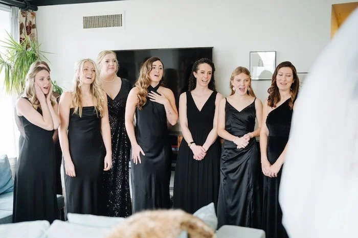 The Peabody Library is a stunning wedding and event venue in Baltimore and was the perfect backdrop for Kate and Stephen’s winter wedding day. The elegant historic wedding venue set the stage for an elegant and chic black tie winter wedding that featured a moody, jewel-toned color palette and cozy vibes. Groom Stephen and his groomsmen wore classic tuxedos for the black tie affair while bridesmaids wore mismatched style long black dresses with fur stoles to keep warm. Bride Kate was a timeless beauty in a simple wedding dress that she paired with a long sleeves lace bolero for wedding portraits and the wedding ceremony.