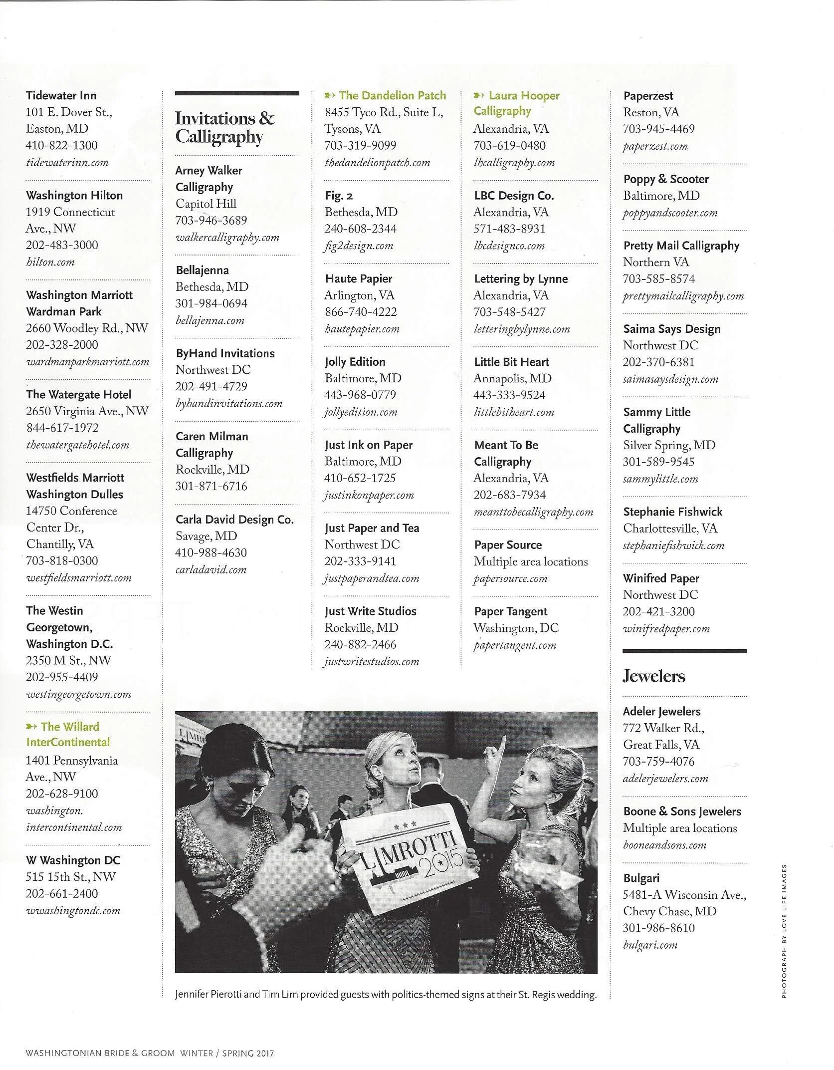 We are honored to be named a "Best Wedding Vendor" for 2017 by Washingtonian Bride and Groom Magazine- for the 15th year in a row! And what incredible weddings we've photographed over the years! We are also excited to see a photo from Jenni + Tim's political-themed winter wedding at the St. Regis featured in the latest issue of Bride & Groom, on newsstands now!