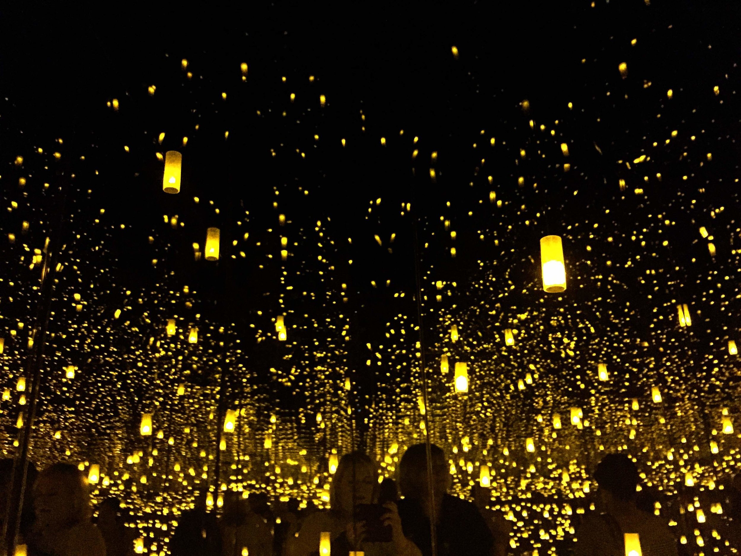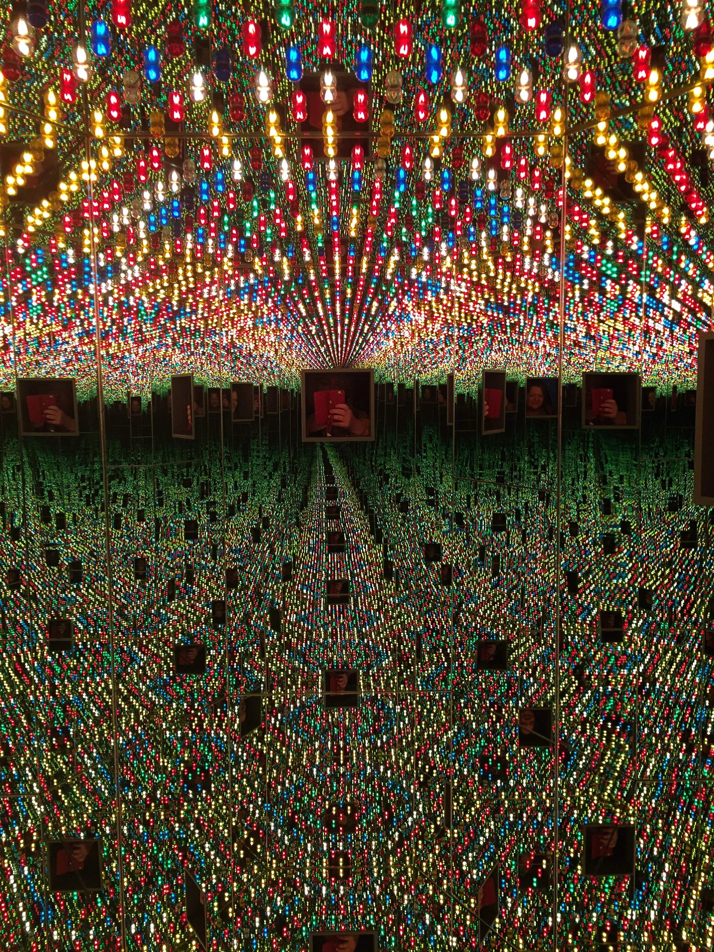 We don't typically write about art openings on our blog, but Yayoi Kusama's Infinity Mirror Rooms at the Hirshhorn Museum is pretty unique. I heard about the Yayoi Kusama's Infinity Rooms from an interview with the artist on CBS News Sunday Morning (I've proclaimed more than once that is one of my favorite shows EVER) and when I heard they were coming to DC, I marked it on my calendar. Ticketing for timed passes was released at noon on Feb 13th and I was ready. The Smithsonian's website, however, was not ready for the overwhelming traffic. Everything crashed and when I tried calling- voice mailboxes were full. I turned to twitter to find helpful info and links to the ticketing system. After navigating some weird glitches, I was able to get two tickets for opening day- 11:30 and 11:45AM. Here's what you really need to know about going: The rooms aren't whole rooms you walk through- they are actually large walk-in box-like rooms with one door in, which means only a few people can actually get into the room at a time, so once you are in the exhibit, you have to wait in line to get into the room-boxes. Some of the lines were 1 to 2 hour wait times, which we did not plan for, so we had to skip most of the rooms. If you plan to go, I would suggest going first thing in the morning (10AM is the earliest) and then leave lots of extra time once you get in to get into the actual infinity mirror rooms. I'm definitely going back- I have passes for next Thursday for the kids, and I will be prepared this time! The Infinity Mirror Rooms are worth seeing.