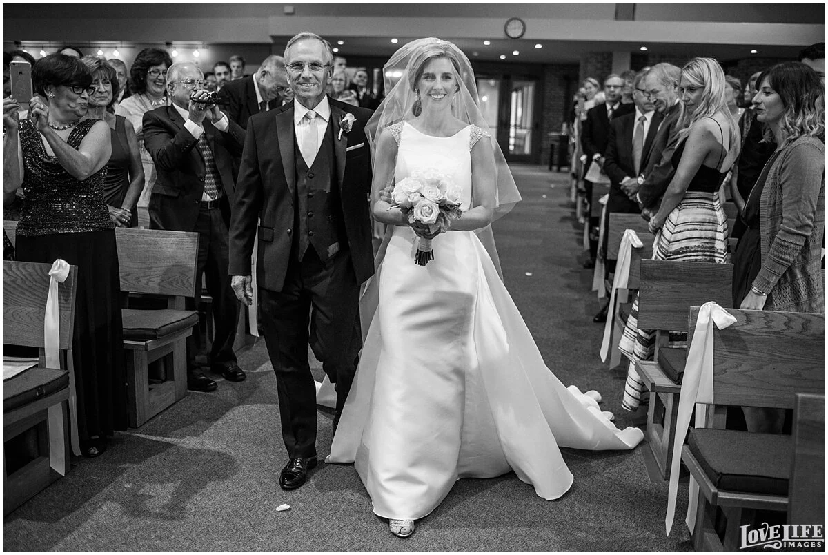 I found some great photographs, too, that I'm proud of. There, on the altar, I noticed the lights behind them and they felt mirror-like in their reflection of the couple in the foreground. As well, when Vicki's father met them as they walked out, I saw him not so much as just her father, but as a stand-in for everyone there, really.