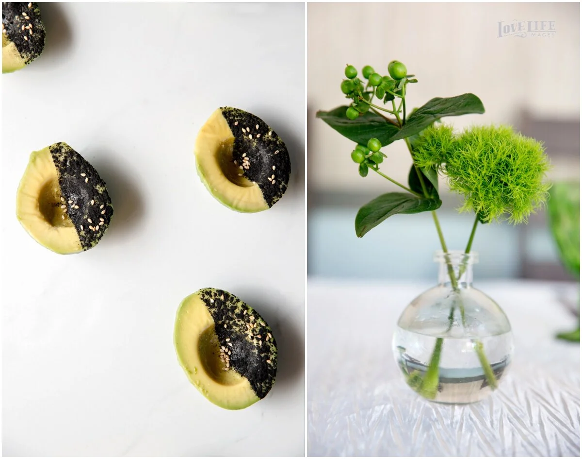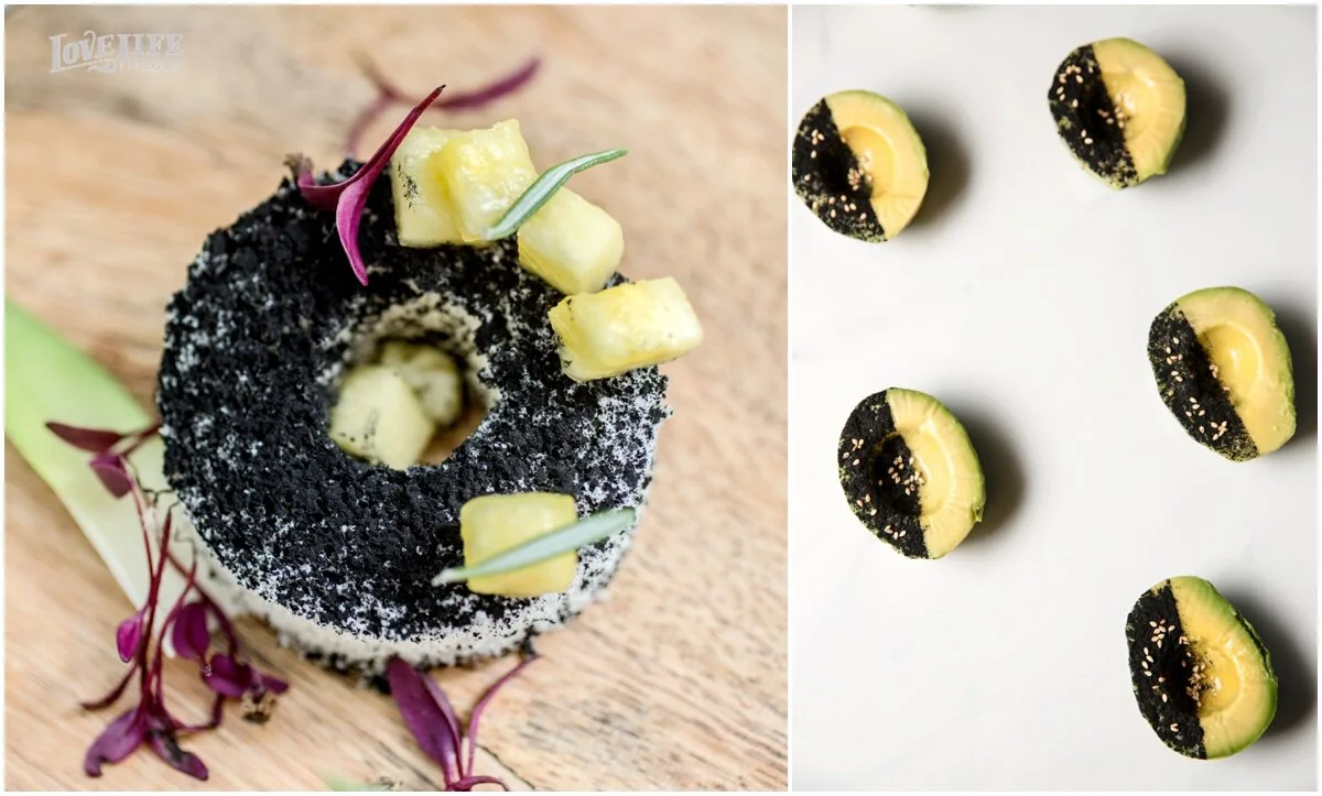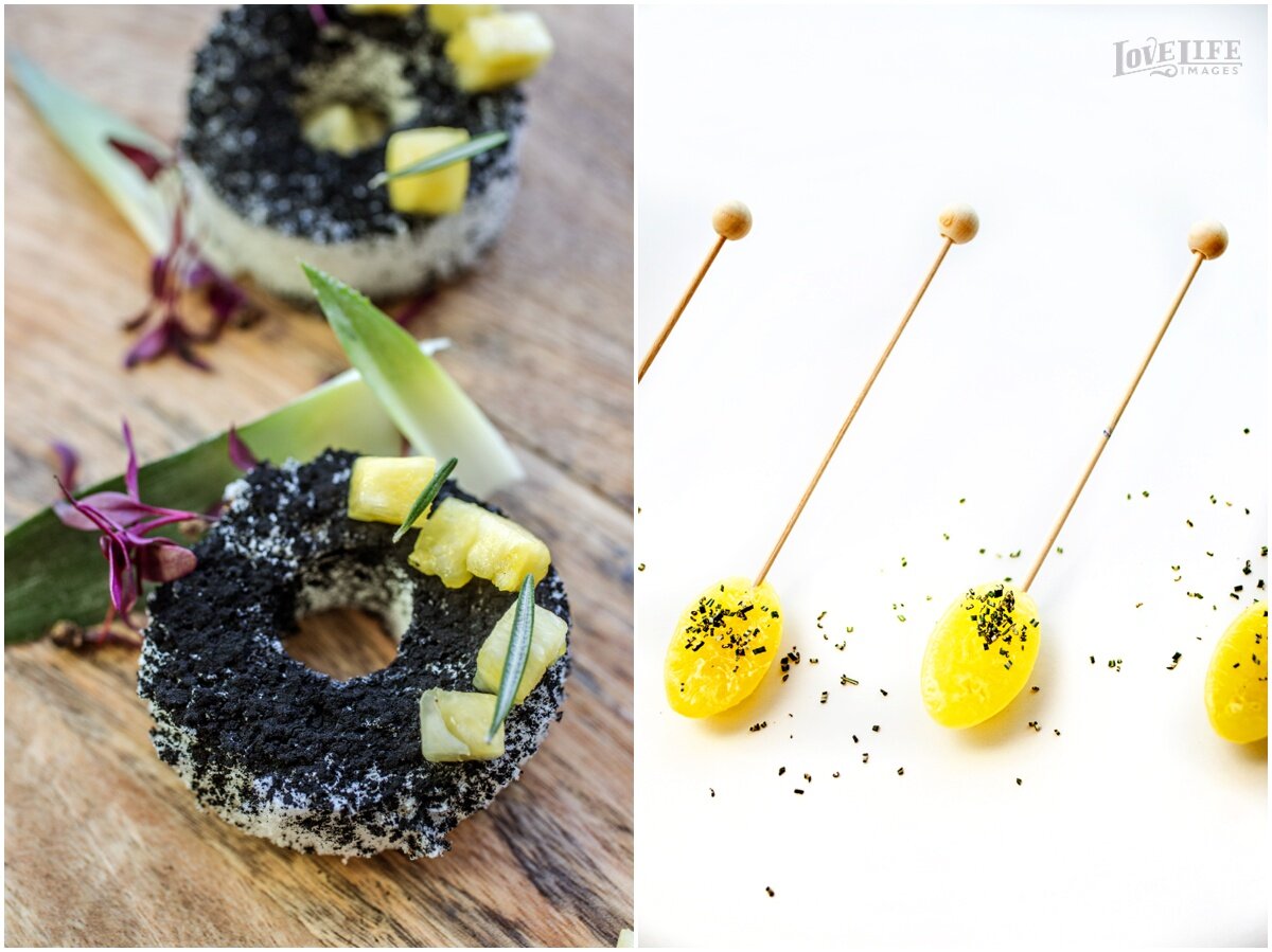 Melissa and Jim Benson of Eleven Courses Catering in Baltimore started their business with private client dinners in their homes, but word of their outstanding and creative culinary offerings spread fast and their business grew to include large wedding and corporate events. They are constantly seeking inspiration, and when I met up with them they had just returned from an Italian culinary trip. Inspired by the classic black dress, these menu items all find good use of black in their display.