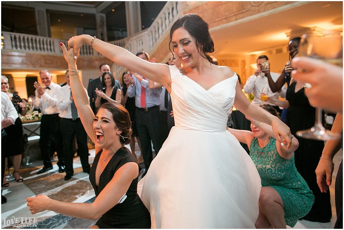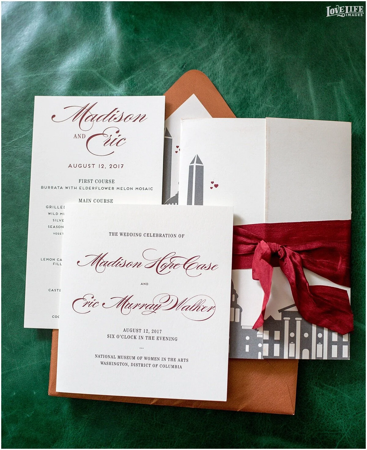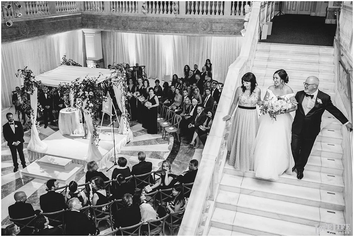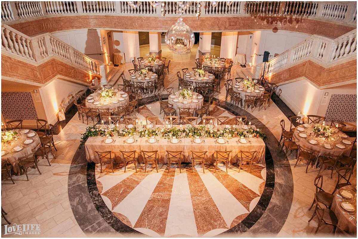 Ceremony + Reception Location: National Museum of Women in the Arts | Coordinator: Aimee, A. Dominick Events | Bridal Shop: Carine's Bridal Atelier | Dress Designer: Romona Keveza | Shoes: Manolo Blahnik | Hair + Makeup: Amie Decker Beauty | Suit/Tux: Modern Tux | Florist: Sweet Root Village | Caterer + Cake: Occasions Caterers | Officiant: Rabbi Hannah Goldstein | Ceremony music: Cherry Blossom String Quartet | Reception music: The Source, Elan Artists | Lighting: Frost Lighting | Invitations: LBrown Design + Paperie