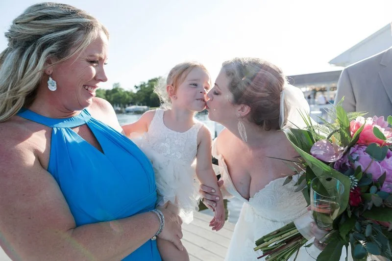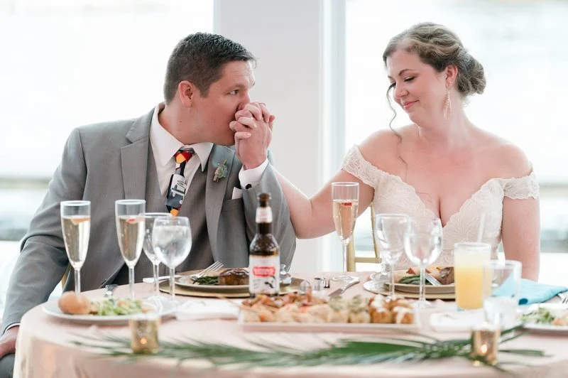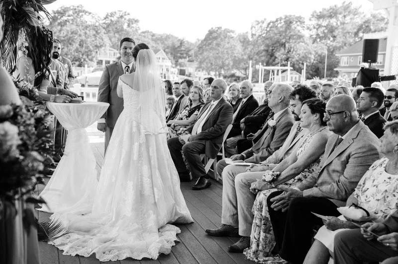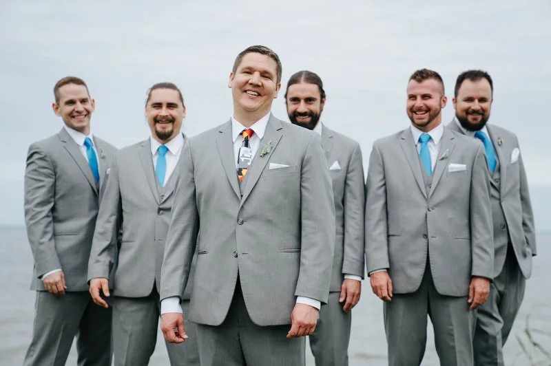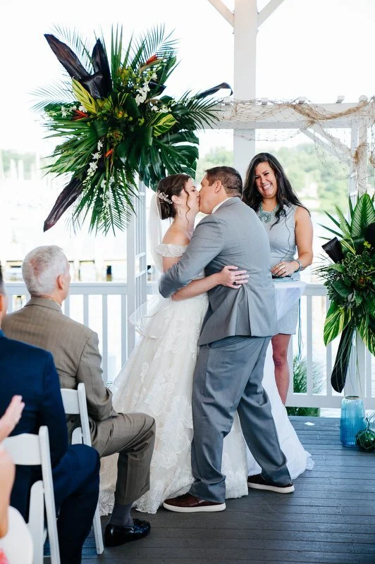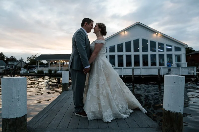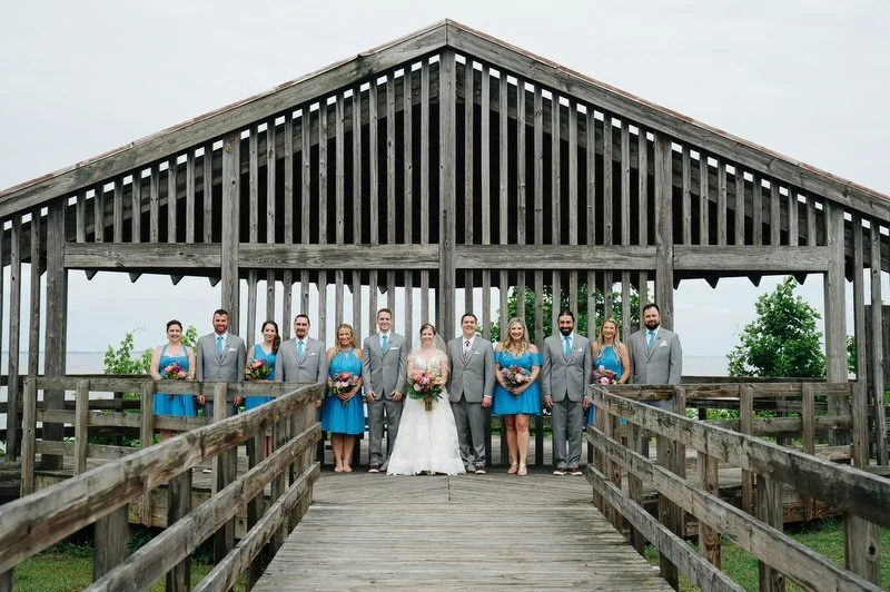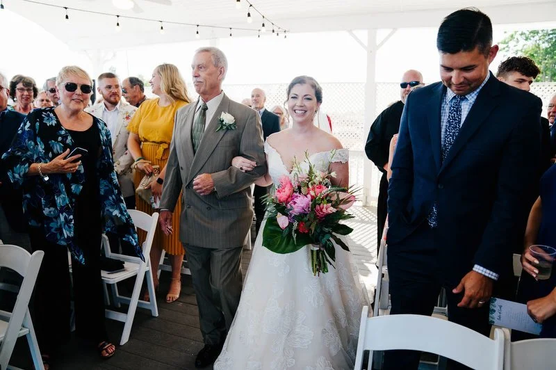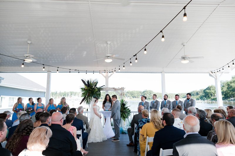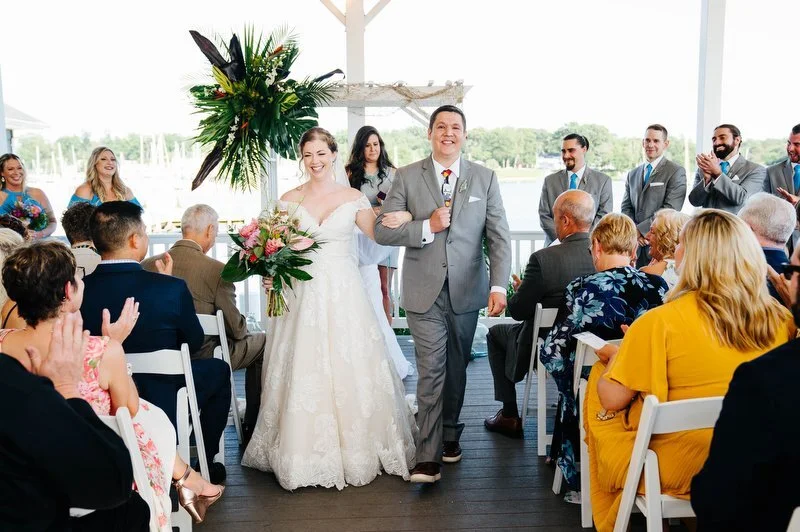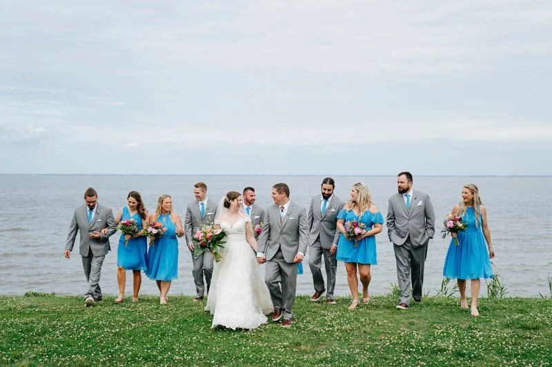 Surrounded by family and friends at the Anchor Inn in Pasadena, Maryland Jamie and Dave exchanged vows and began their married life. We were lucky that pandemic restrictions were recently lifted, so we got to celebrate mask-free and with all their guests in attendance. Embracing the waterfront venue, Jamie and Dave incorporated beach-themed details from their palm leave invitation suite to sea glass escort cards and driftwood accents. Bouquets full of tropical flowers, bright blue bridesmaids dresses and light grey suits for the groomsmen allowed this wedding party to fully embrace the fun of summer!