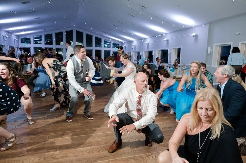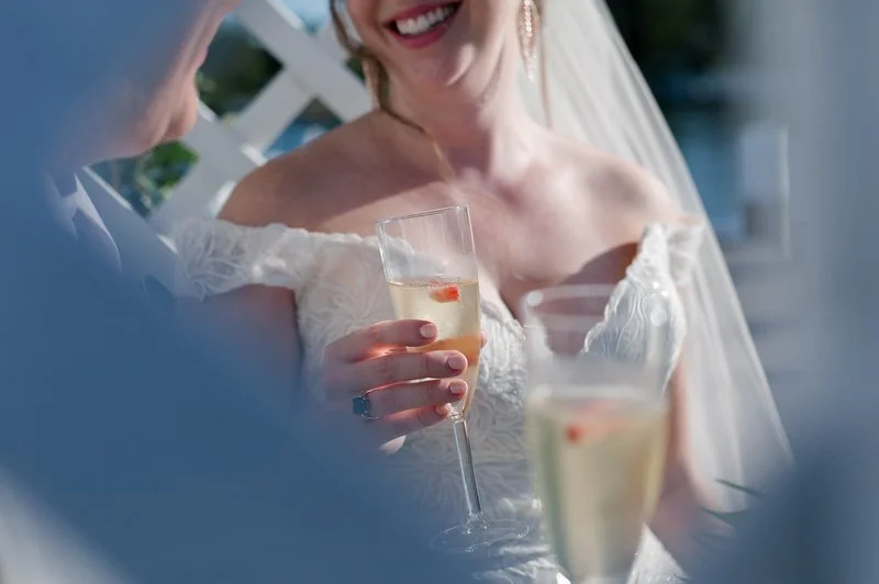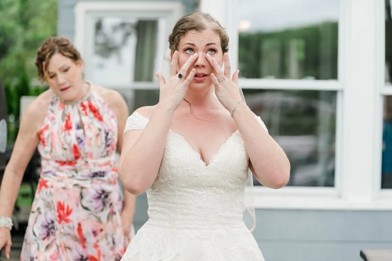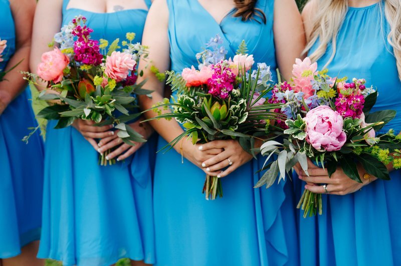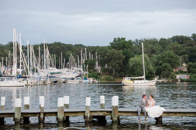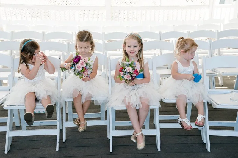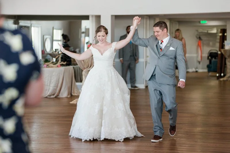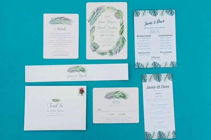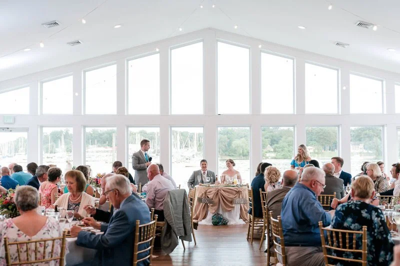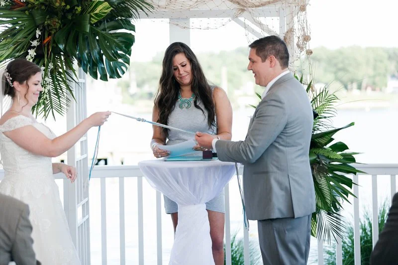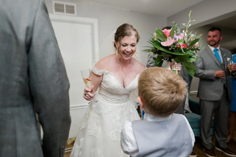 Surrounded by family and friends at the Anchor Inn in Pasadena, Maryland Jamie and Dave exchanged vows and began their married life. We were lucky that pandemic restrictions were recently lifted, so we got to celebrate mask-free and with all their guests in attendance. Embracing the waterfront venue, Jamie and Dave incorporated beach-themed details from their palm leave invitation suite to sea glass escort cards and driftwood accents. Bouquets full of tropical flowers, bright blue bridesmaids dresses and light grey suits for the groomsmen allowed this wedding party to fully embrace the fun of summer!