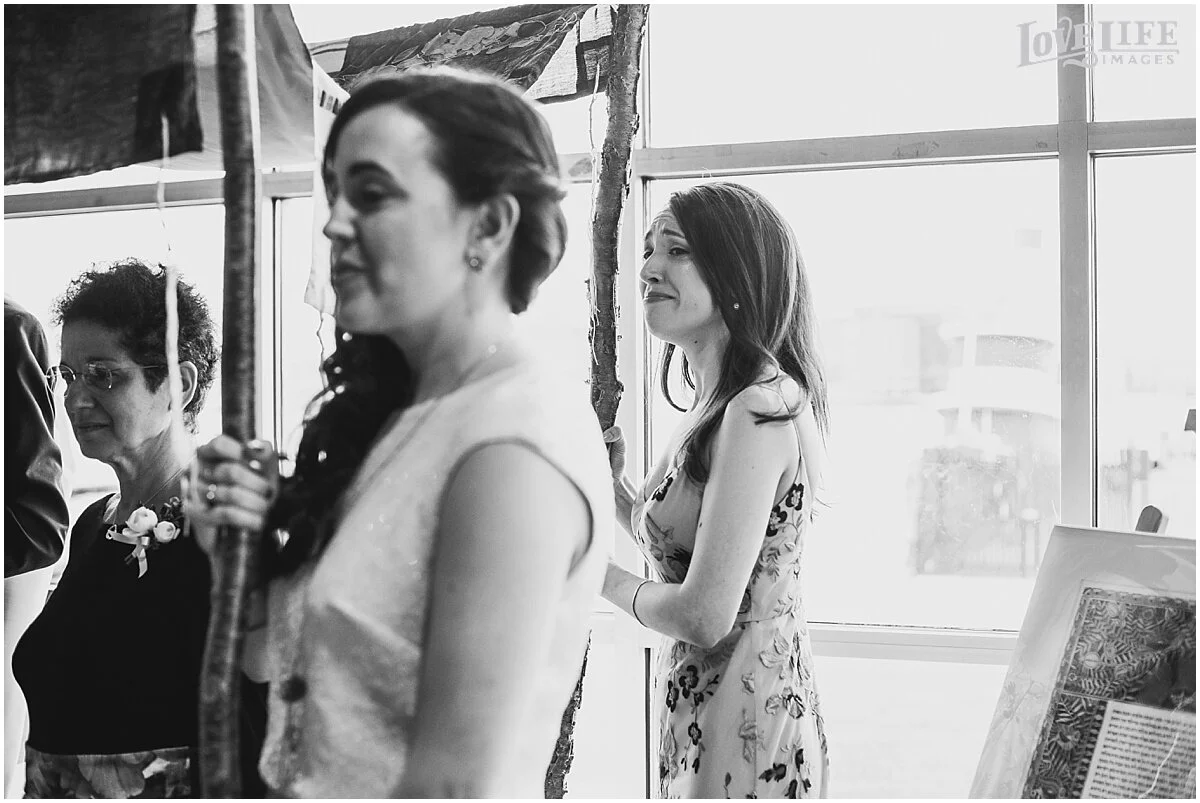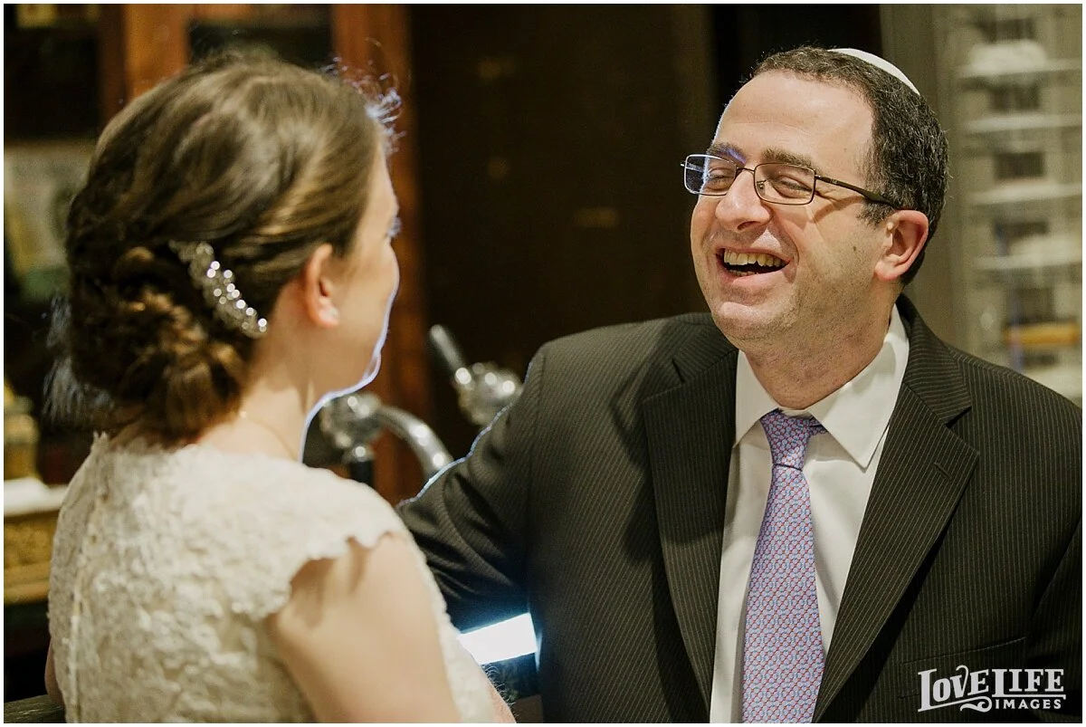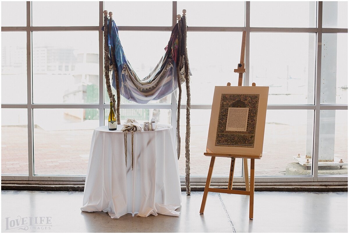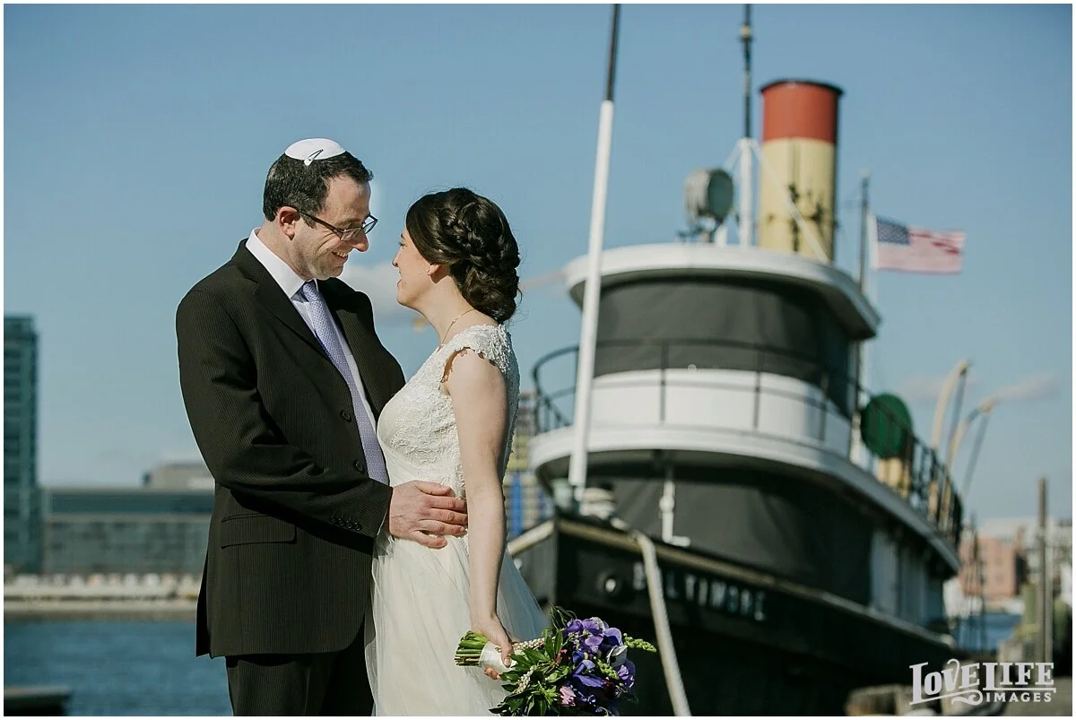 Many of Ilana and Raphael’s family and friends travelled from afar to celebrate their union on this early spring day. It was brisk outside but warm and welcoming at the BMI. There were many personal touches at their wedding. The chuppah canopy is made up of prayer shawls from Ilana’s mom and grandma. Docked outside is a steam powered tugboat from 1906.Raphael is an economist and one of his research topics is industrialization and specifically, the steam engine- what a coincidence!