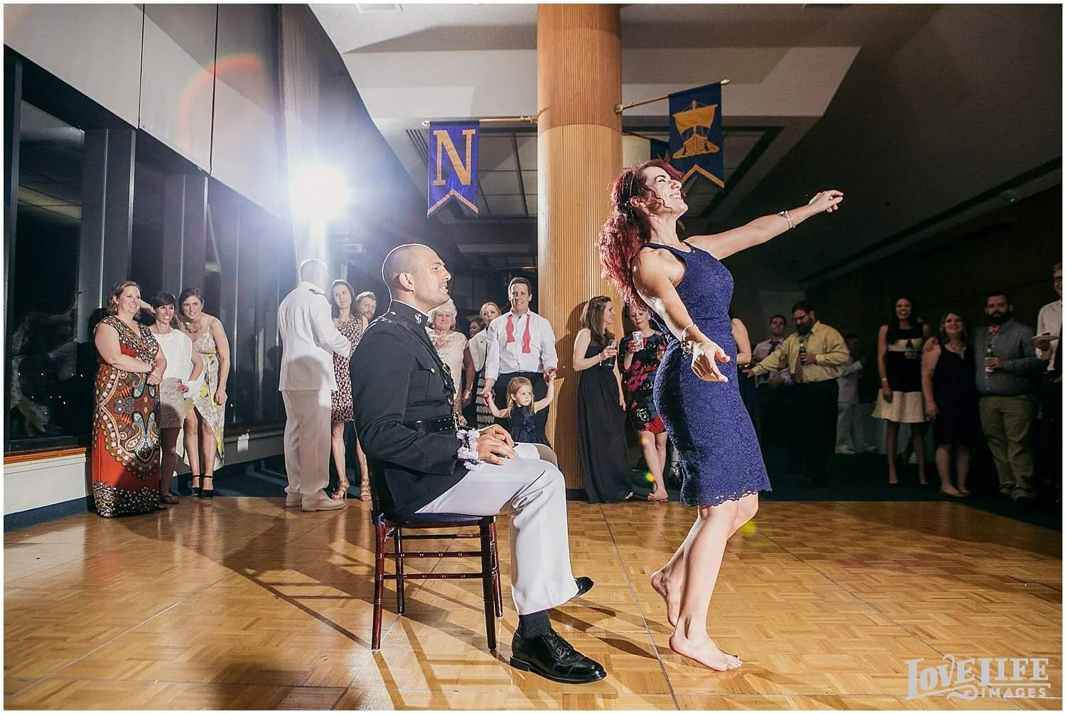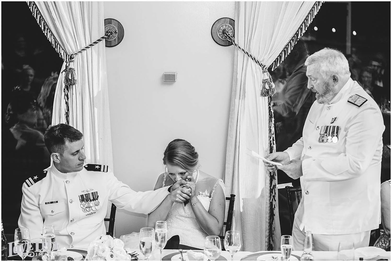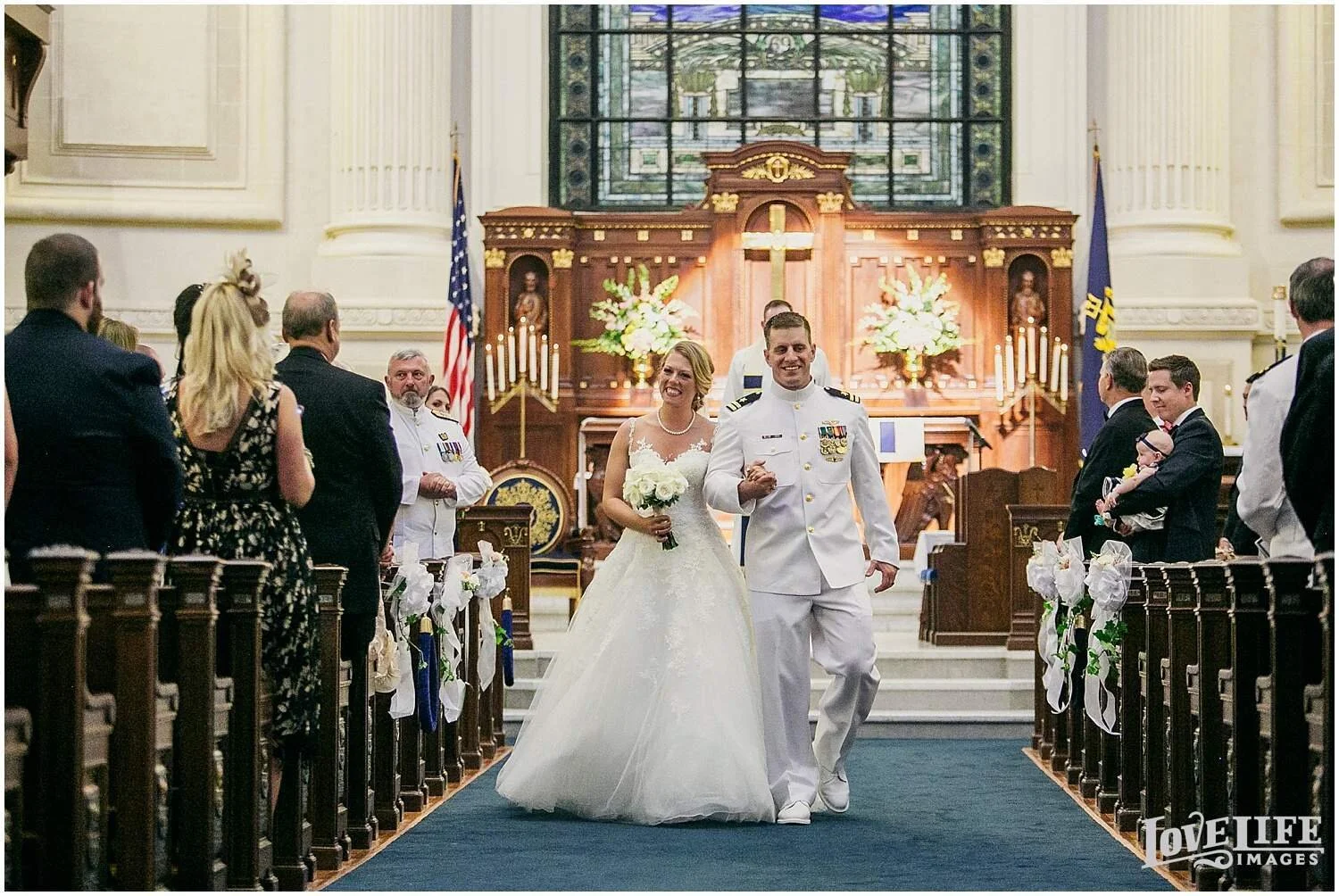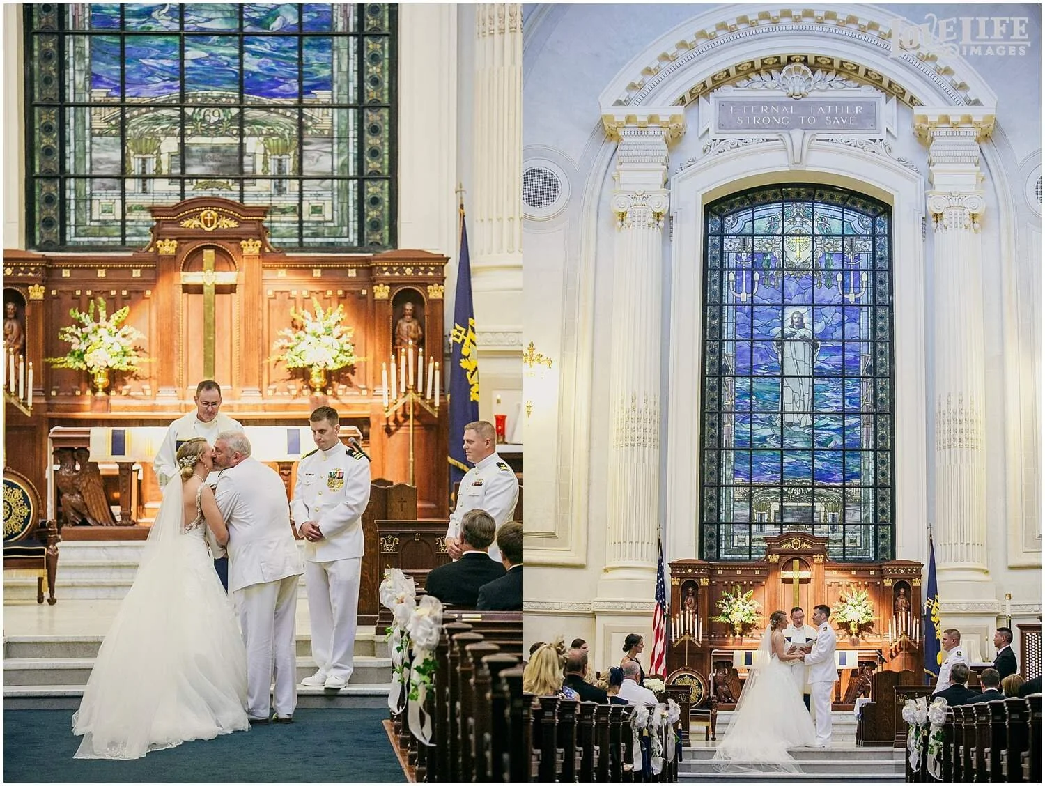 This lovely couple wanted to have a private moment before their nuptials but did not want to do a first-look. After they both finished getting ready, Kevin came to the door in the basement of the Naval Academy Chapel where Rebecca anxiously waited. They each stood on one side of the door, holding hands just to feel the closeness of each other before heading to the alter.